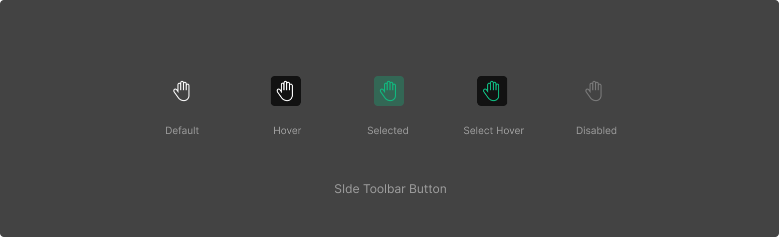 Toolbar Button의 경우 5가지 (Default, Hover, Selected, Select Hover, Disabled)로 구성되어져 있습니다. 사용되는 목적에 따라서 Selected와 Select Hover가 생략되어 사용되어 질 수 있습니다.