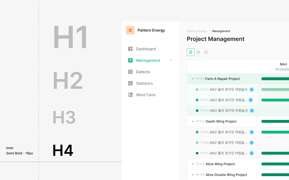 기준 영문 서체는 Pretendard Family Typeface를 사용하고 Type Weight는 Regular(400), Medium(500), Semi Bold(600)으로 사용합니다